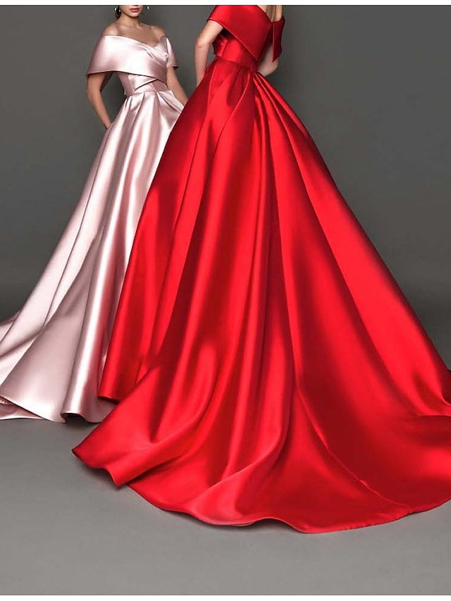 Occasion:Quinceanera,Formal Evening,Style:Princess,Minimalist,Celebrity Style,Silhouette:Ball Gown,Hemline / Train:Court Train,Neckline:Off Shoulder,Fabric:Satin,Closure:Zipper UP,Sleeve Length:Short Sleeve,Embellishment:Pure Color,Pleats,Tips:Colors may vary slightly due to different monitor settings,Professional dry cleaner only,
