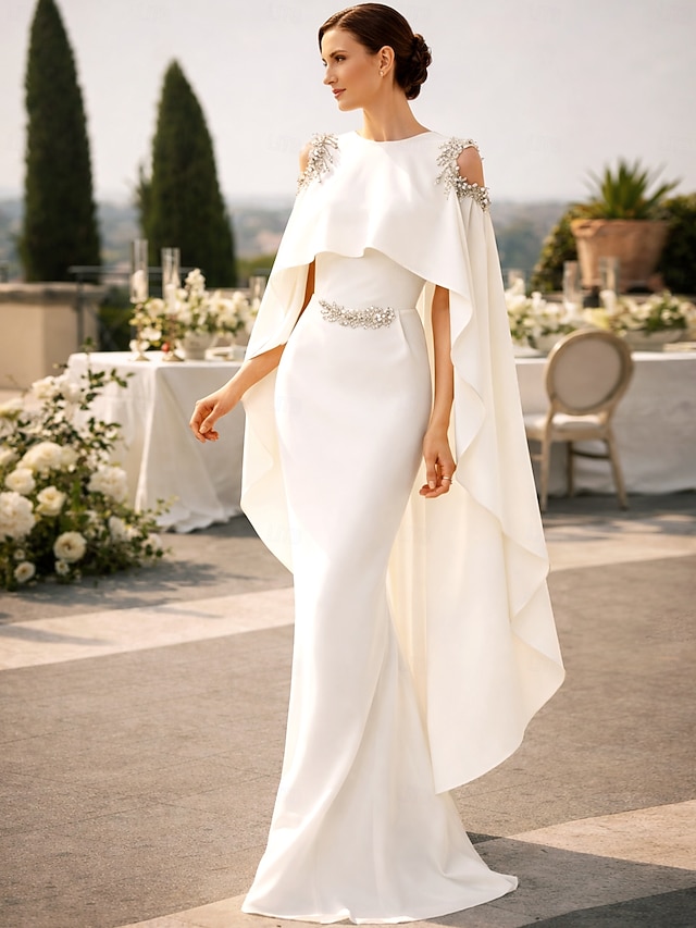 Mermaid Trumpet Floor Length Ball Gown with Cape Evening Gown Formal Dress Elegant Maxi Sleeveless Jewel Neck Formal Wedding Guest Capes Stretch Chiffon with Appliques #9514374