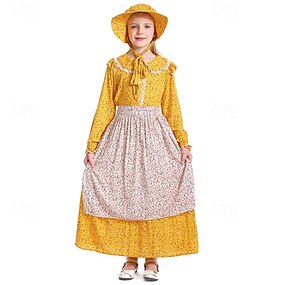 250º Aniversario de EE. UU. Siglo 19 década de 1800 Vestido de la pradera Conjunto de gorro y delantal Larga Chica pionera Colonial Pionero Guerra Revolucionaria Floral Disfraz Chica Víspera de Todos