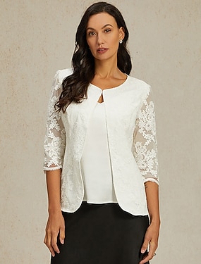 Mujer chaqueta Ligero Encaje Bordado Elegante Floral Formal Largo Cuello redondo Ajuste regular Manga Larga Ropa de calle Blanco Verano Primavera