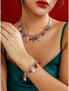 Conjunto de collar y pulsera navideños para mujer: cadena plateada con cuentas rojas, colgantes de copo de nieve, árbol y regalo. Joyería festiva para fiestas y regalos.