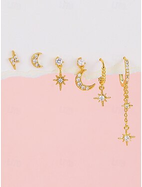 Conjunto de pendientes desiguales de estrella y luna chapados en oro para mujer: delicados pendientes de tachuelas y colgantes de circonitas celestiales para fiestas de moda, regalos y uso diario.