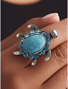 Anillo vintage de tortuga para mujer con turquesa azul: joya bohemia con diseño animal para vacaciones en la playa, festivales y ropa informal.