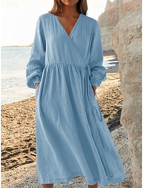 Mujer Vestido Midi Lino de algodón sintético Vestido de una línea Casual Diario Ajuste regular Plano Manga Larga Cuello con muescas. Azul Piscina Negro Blanco Amarillo Verano Primavera