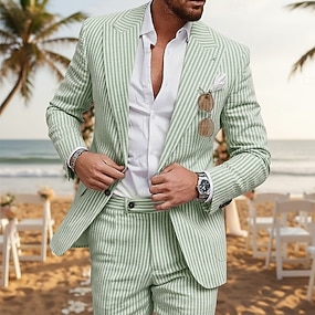 De los hombres Trajes Trajes de seersucker boda en la playa Casual Azul cielo Salvia Primavera, Otoño, Invierno, Verano Traje Ligeras Color sólido Estándar Juego de 2 piezas Recto 2 botones