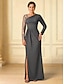 Vestido de noche elegante de corte tubo/columna verde, vestido formal para boda, cola larga/cepillo, sin mangas, un hombro, satén elástico con volantes y abertura 2025
