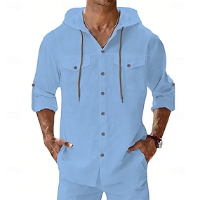 Hombre Camisa Camisa de lino Camisa de verano Ropa de playa Abotonar la camisa Color sólido Casual Vacaciones Azul Piscina Negro Blanco Azul Marino Manga Larga Con Capucha Verano Primavera Ropa Correa