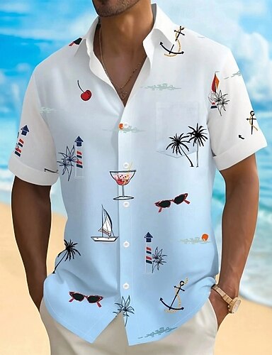 Hombre Ancla Camisa casual camisa hawaiana Manga Corta Hawaiano Casual Complejo Vacaciones Casual Verano Primavera Cuello Vuelto Abotonar Amarillo Azul Piscina Azul cielo