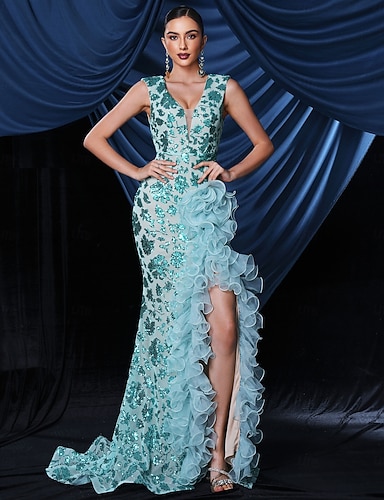 Corte Trompeta / Sirena Hasta el Suelo Vestidos de noche Elegante Lentejuelas Sin Mangas Escote en Pico Formal Boda Encaje con Fruncido Lentejuela Abertura