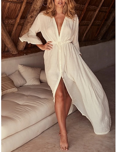 Mujer Vestido largo maxi Vestido maxi Lino de algodón sintético Vestido de Camisa Vestido de verano Vestido Kaftan Vacaciones Básico Moderno Diario Fin de semana Holgado Plano Manga 3/4 Escote en Pico