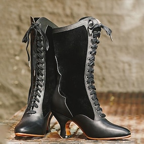 Botas altas hasta la rodilla con encaje negro de inspiración victoriana de la década de 1890 para mujer, con lazo y tacones con detalles para elegantes reuniones vintage y fiestas temáticas. &eventos