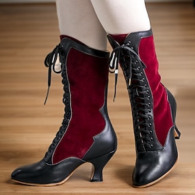 Botas victorianas con cordones de media pantorrilla para mujer, década de 1900: calzado de tacón retro de satén burdeos y piel sintética negra para disfraces históricos, fiestas Gatsby y representaciones teatrales.