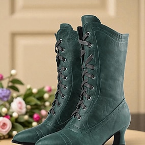 Botas de media pantorrilla con cordones y lentejuelas de charol sintético verde para mujer: botas vintage de tacón grueso inspiradas en los años 30 para actuaciones en el escenario, fiestas góticas y