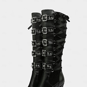 Botas altas hasta la rodilla de piel sintética negra para mujer con detalle de tachuelas: calzado de tacón grueso de inspiración medieval para otoño, invierno y fiestas nocturnas.