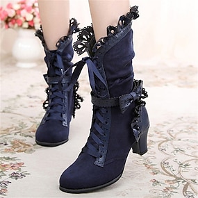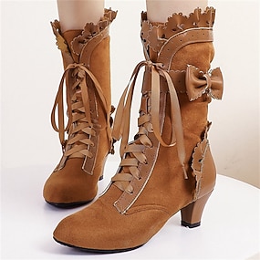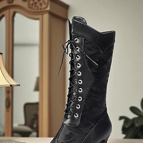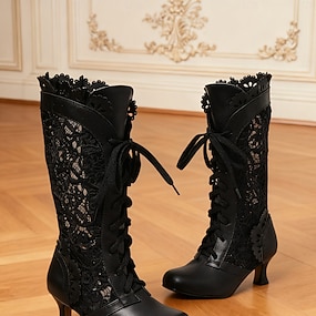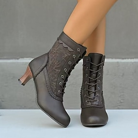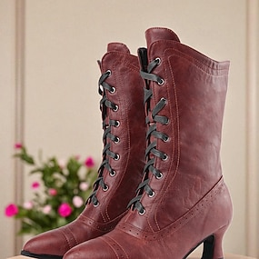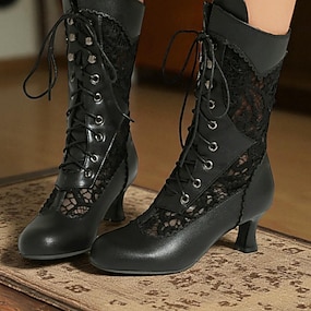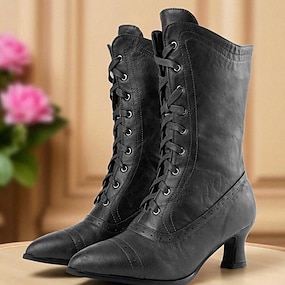 Botas victorianas de media pantorrilla con cordones para mujer con diseño de encaje vintage y detalles de piel sintética: estilo retro para cosplay, eventos formales y uso diario.