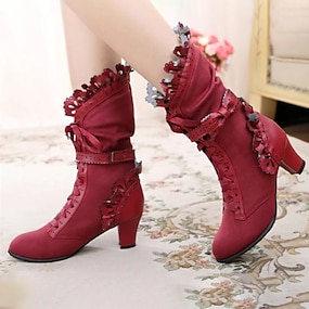Botas victorianas con cordones de media pantorrilla para mujer, década de 1900: calzado de tacón retro de satén burdeos y piel sintética negra para disfraces históricos, fiestas Gatsby y representaciones teatrales.