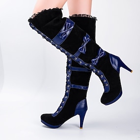 Botas negras con cordones hasta la rodilla para mujer: botas vintage de gamuza sintética con tacón grueso para la moda de otoño e invierno