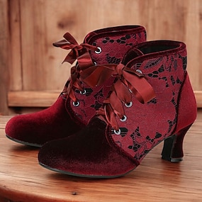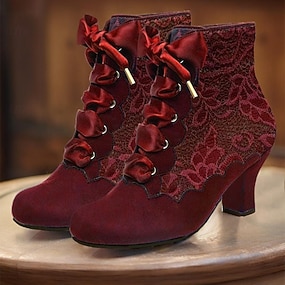 Botines victorianos burdeos con cordones para mujer, diseño de encaje floral y tacón medio: estilo retro elegante para ocasiones formales e informales