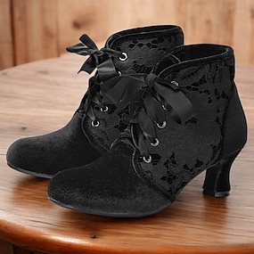 Botines negros de encaje de inspiración eduardiana para mujer: botines victorianos con cordones y tacón medio de malla vintage para moda gótica, cosplay y atuendos de la década de 1900.