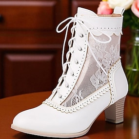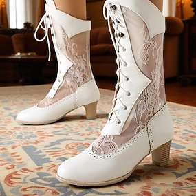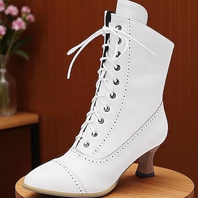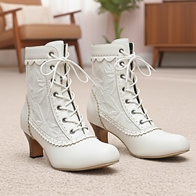 Botas blancas con cordones de estilo victoriano para mujer con detalles de encaje y tacones medios para un uso elegante y vintage.