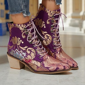 Botines con cordones en jacquard morado para mujer con bordado floral y tacón bajo de bloque: botas de estilo barroco vintage para mujer, perfectas para festivales y fiestas Gatsby.