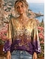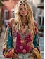 Blusa Boho de Mujer Como Lino Transpirable Ligera Floral Elegante Bohemia Vintage Manga Larga Cuello en V Tops Regulares Diario Vacaciones Patchwork Botones Impresión Rojo Púrpura Claro Verano