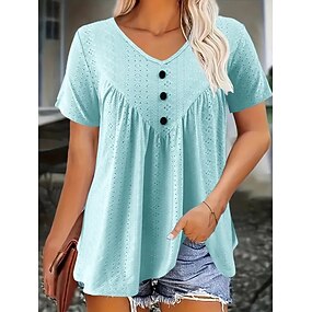 Mujer Camiseta Camiseta superior Ojal Botones Plano Moda Elegante Clásico Manga Corta Escote en Pico Tops regulares Diario Noche Fin de semana Azul Piscina Rosa Verano Primavera