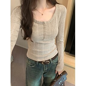 Mujer Tops tejidos de canalé Camiseta Ojal Vintage Casual Manga Larga Cuello Barco Escote Redondo Tops regulares Diario Noche Fin de semana Azul Piscina Granate Negro Vino Verde Ejército Primavera