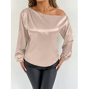 Mujer Satén Camiseta superior Elegante Manga Larga Manga Farol Hombros Caídos Tops regulares Diario Noche Negro Blanco Verde Claro Albaricoque Primavera Otoño