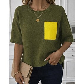 Mujer Camiseta de punto Camiseta superior Bolsillo Borroso División lateral Color sólido Elegante Vintage Casual Manga Corta Cuello Barco Tops regulares Diario Noche Verde Ejército Primavera Otoño