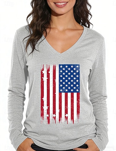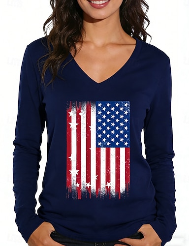 día de la independencia americana Mujer Camiseta Camiseta superior Estampado Graphic Bandera estadounidense Elegante Clásico Casual Manga Larga Escote en Pico Tops regulares Diario Deportes Noche