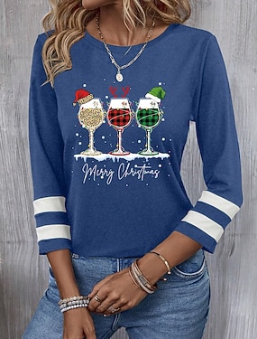 Camisa Blusa de Mujer Navidad Vaso de Vino Casual de Manga Larga Cuello Redondo Tops Regulares Diarios Patchwork Negro Vino Azul Verde Otoño Invierno