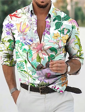 Hombre Floral Flores tropicales Camisa camisa hawaiana Manga Larga Camisa Cuello Vuelto Moda Design Casual Vacaciones Diario Festivos Verde Claro Púrpula Claro Morado Impresión 3D S M L
