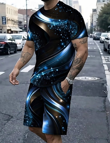 Hombre Galaxia 2 piezas Conjuntos de camisetas Tops de verano Manga Corta Pantalones cortos Cuello Barco Deportes Casual De moda Diario Vacaciones Noche Impresión 3D Verano Azul Piscina Rojo Morado