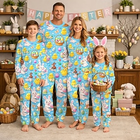 Mirada familiar Semana Santa Pijamas Graphic Conejito Casual Estampado Azul Piscina Negro Blanco Manga Larga Vacaciones Trajes a juego