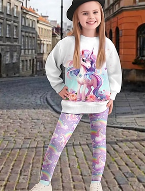 Chica 3D Unicornio Conjunto de sudadera y leggings Rosa Manga Larga Impresión 3D Primavera Otoño Activo Moda Diario Niños 3-12 años Cuello Barco Exterior Vacaciones Cita Ajuste regular
