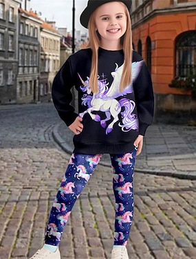 Chica 3D Unicornio Camiseta y mallas Conjunto de vestido con volantes Manga Larga Impresión 3D Otoño Invierno Activo Moda Diario Niños 3-12 años Exterior Vacaciones Cita Ajuste regular