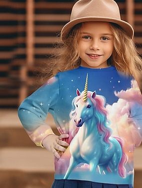 Chica 3D Graphic Animal Unicornio Camiseta Manga Larga Primavera Otoño Moda Básico Niños 4-12 años Cuello Barco Exterior Casual Diario Ajuste regular