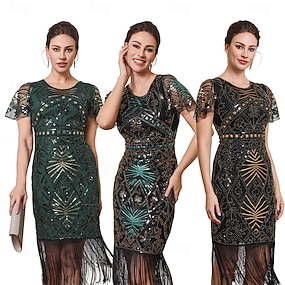 Conjunto Rugido 20s 1920s Mediodía Vestido Flapper Vestido Cóctel Disfraz de lujo con accesorios Mangas cortas El gran Gatsby Chica de la aleta Lentejuelas Borlas Escote en Pico Disfraz Mujer Navidad