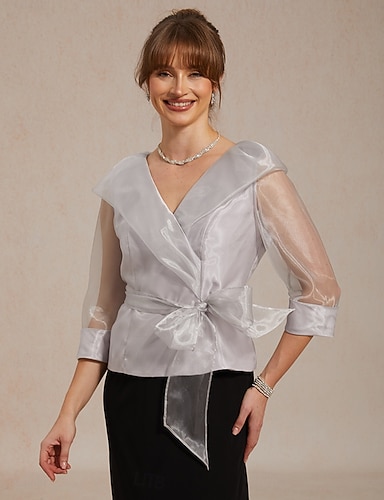 Mujer Tops envolventes Blusa transparente Tops elegantes Plisado Metálico Elegante Fiesta Manga Larga Manga de la linterna Escote en Pico Tops regulares Invitado a la boda Ropa de fiesta de noche