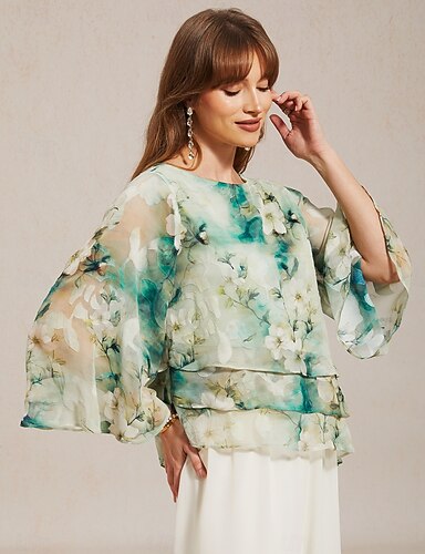 Mujer Tops de gasa Plisado Multi capa Metálico Elegante Manga 3/4 Cuello Barco Tops regulares Invitado a la boda Verde Claro Verano Primavera Otoño