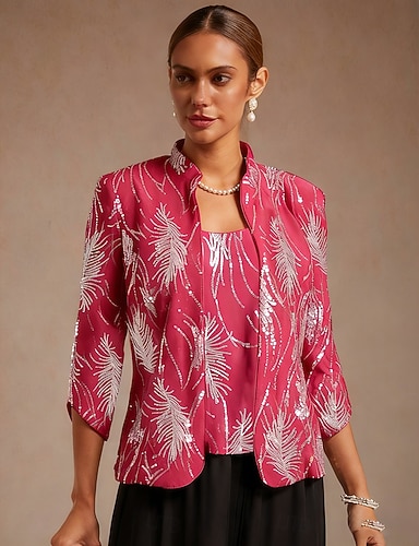 Mujer Blusa Tops elegantes Tops de noche Lentejuelas Pluma Elegante Manga 3/4 Collar mandarín Tops regulares Fiesta de Noche Ropa de fiesta de noche Verde esmeralda Primavera Otoño Invierno