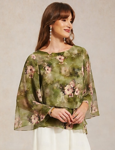 Mujer se encoge de hombros Encaje de ilusión Floral Elegante Básico Manga 3/4 Cuello vuelto holgado Diario Invitado a la boda Ropa de vacaciones Verde cazador Verano Primavera Otoño