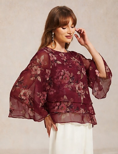 Mujer Camisa de encaje Blusa Tops elegantes Tops de gasa Costura asimétrica Color sólido Floral Elegante Media Manga Mangas anchas Escote Barco Tops regulares Diario Trabajo Invitado a la boda