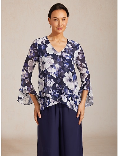 Mujer Camisa de encaje Blusa Tops elegantes Tops de gasa Costura asimétrica Color sólido Floral Elegante Manga 3/4 Campana Escote Barco Tops regulares Diario Trabajo Invitado a la boda Gris cielo