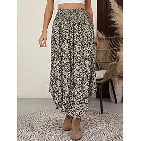 Mujer Falda de vacaciones Estilo lindo Casual Maxi Tiro Medio Faldas Floral Frunce Estampado Elástico Calle Noche Negro Verano Poliéster