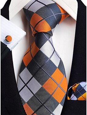Conjunto de corbata a cuadros naranja y azul marino para hombre con pañuelo de bolsillo y gemelos: un elegante accesorio formal para bodas y atuendos de negocios