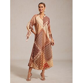 Vestido largo para mujer con estampado geométrico floral de patchwork, cuello alto, manga 3/4, primavera y otoño