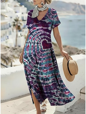 Mujer Vestido largo maxi Vestido bohemio Vestido informal Vestido de una línea Vestido Estampado Vintage Exterior Vacaciones Fin de semana Ajuste regular Corazón Tie-dye Abstracto Manga Corta Escote