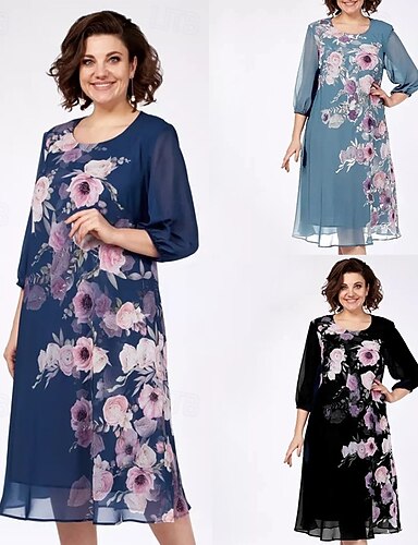 Mujer Vestido hasta la Rodilla Vestido de cambio Casual Ajuste regular Floral Graphic Manga 3/4 Cuello Barco Azul Piscina Blanco Amarillo Verano Primavera